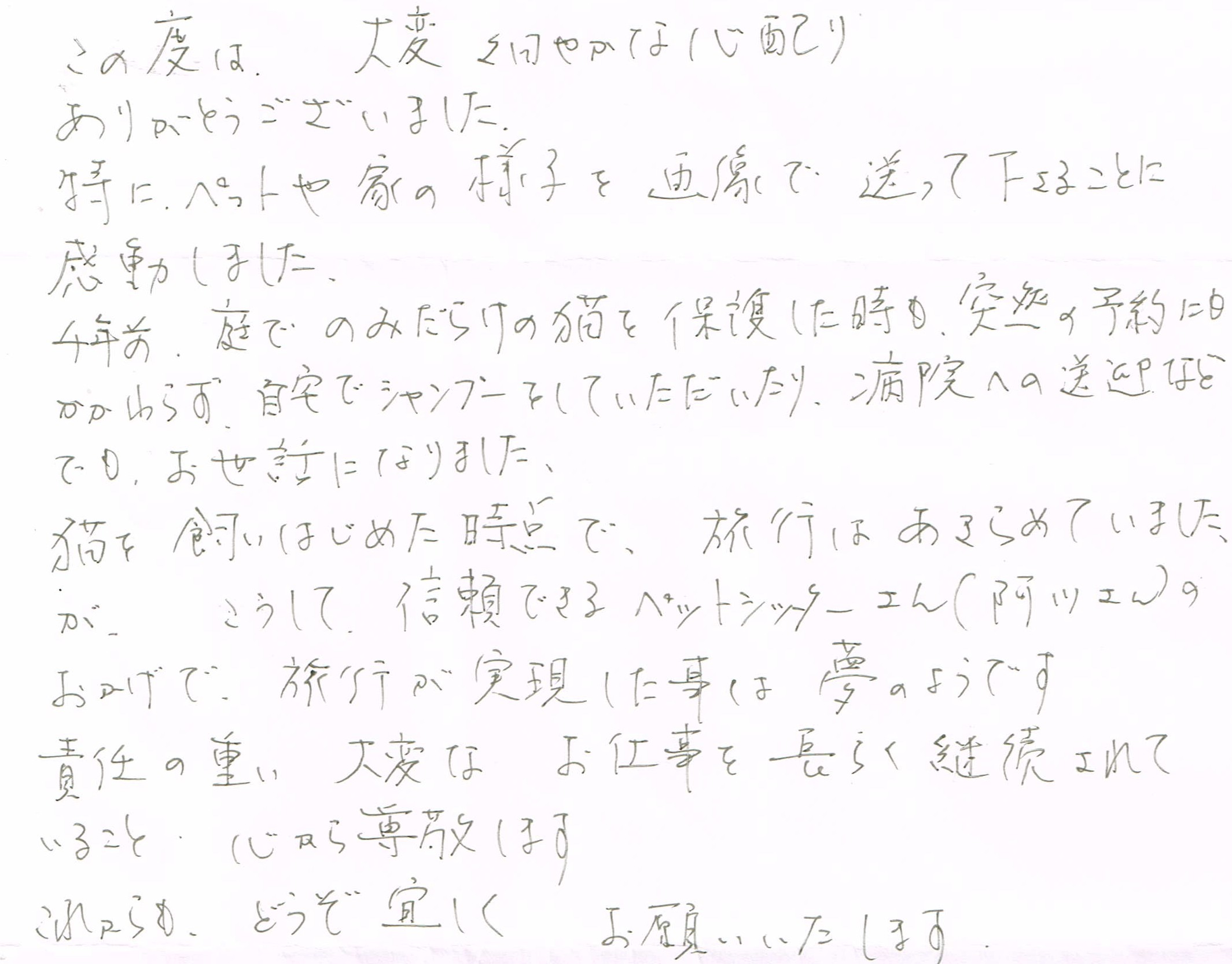 猫を飼いはじめた時点で、旅行はあきらめていましたが、こうして、信頼できるペットシッターさん(阿川さん)のおかげで、旅行が実現した事は夢のようです。