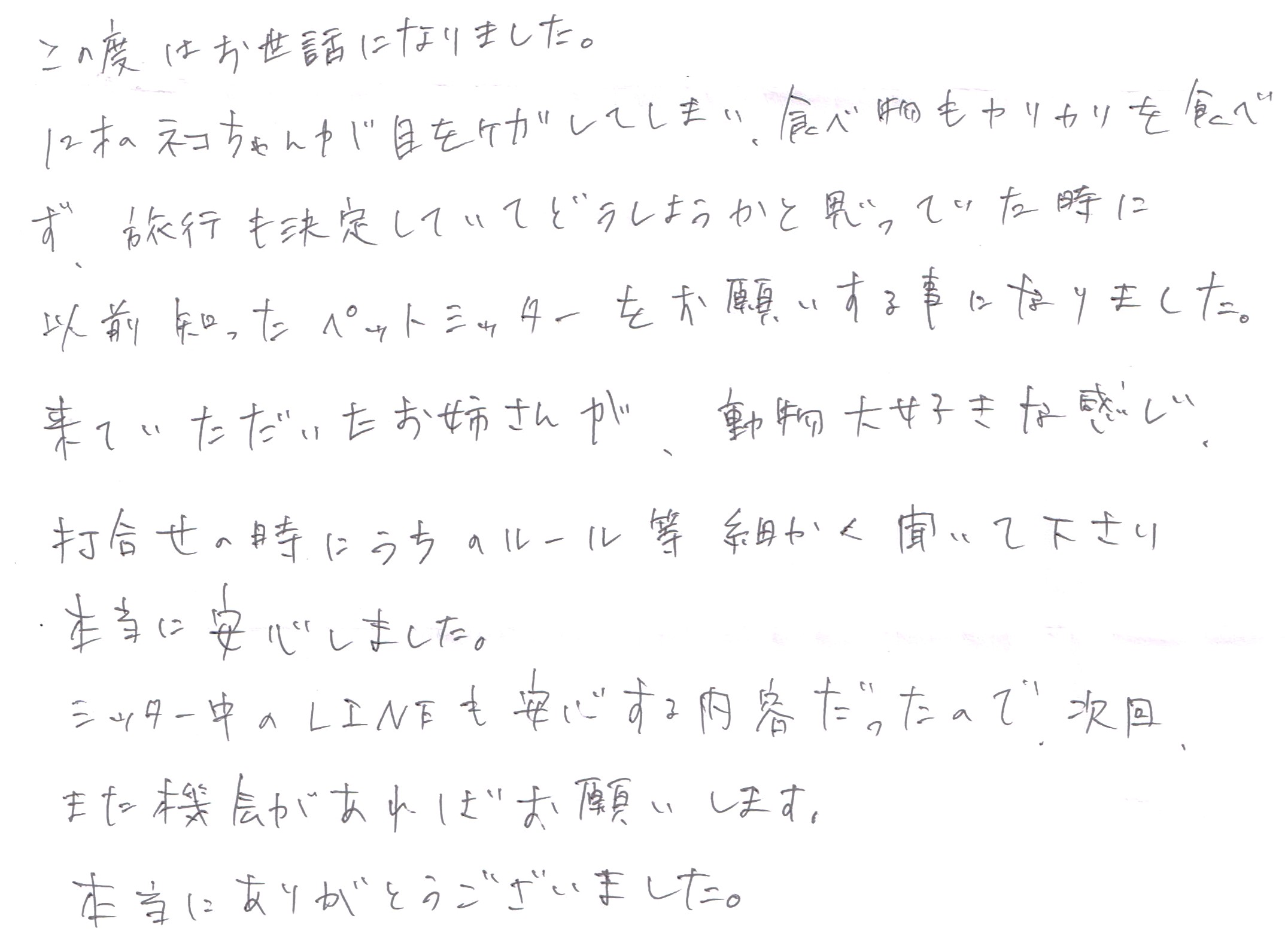 来ていただいたお姉さんが、動物大好きな感じ、打合せの時にうちのルール等、細かく聞いて下さり本当に安心しました。