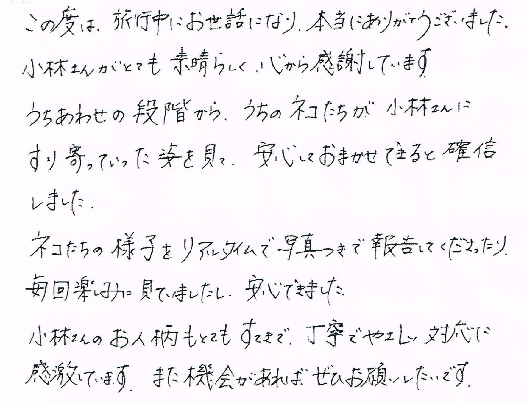 ネコたちの様子をリアルタイムで写真つきで報告してくださったり、毎回楽しみに見ていましたし、安心できました。