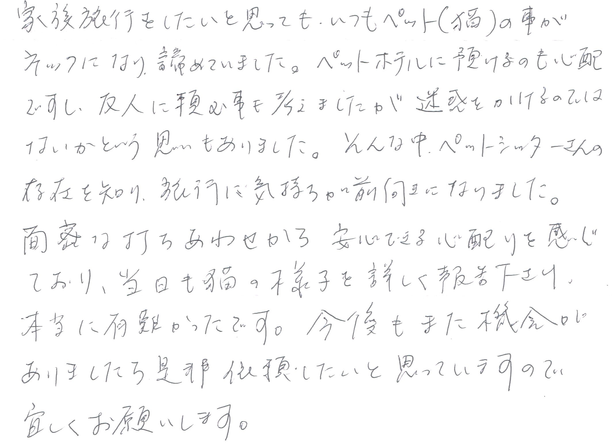 面密な打ちあわせから、安心できる心配りを感じており、当日も猫の様子を詳しく報告下さり、本当に有難かったです。