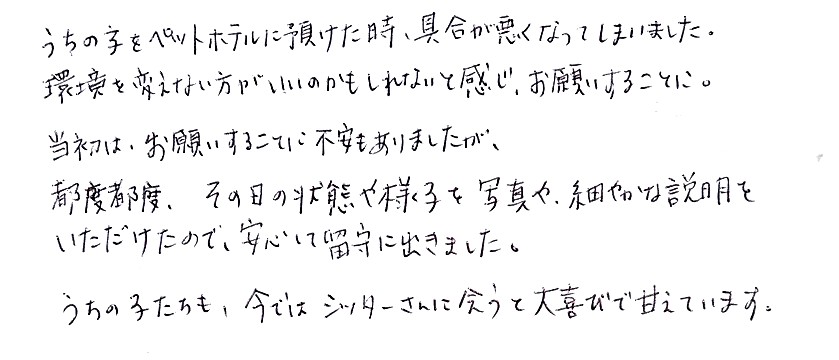 当初は、お願いすることに不安もありましたが、都度都度、その日の状態や様子を写真や、細やかな説明をいただけたので、安心して留守に出きました。