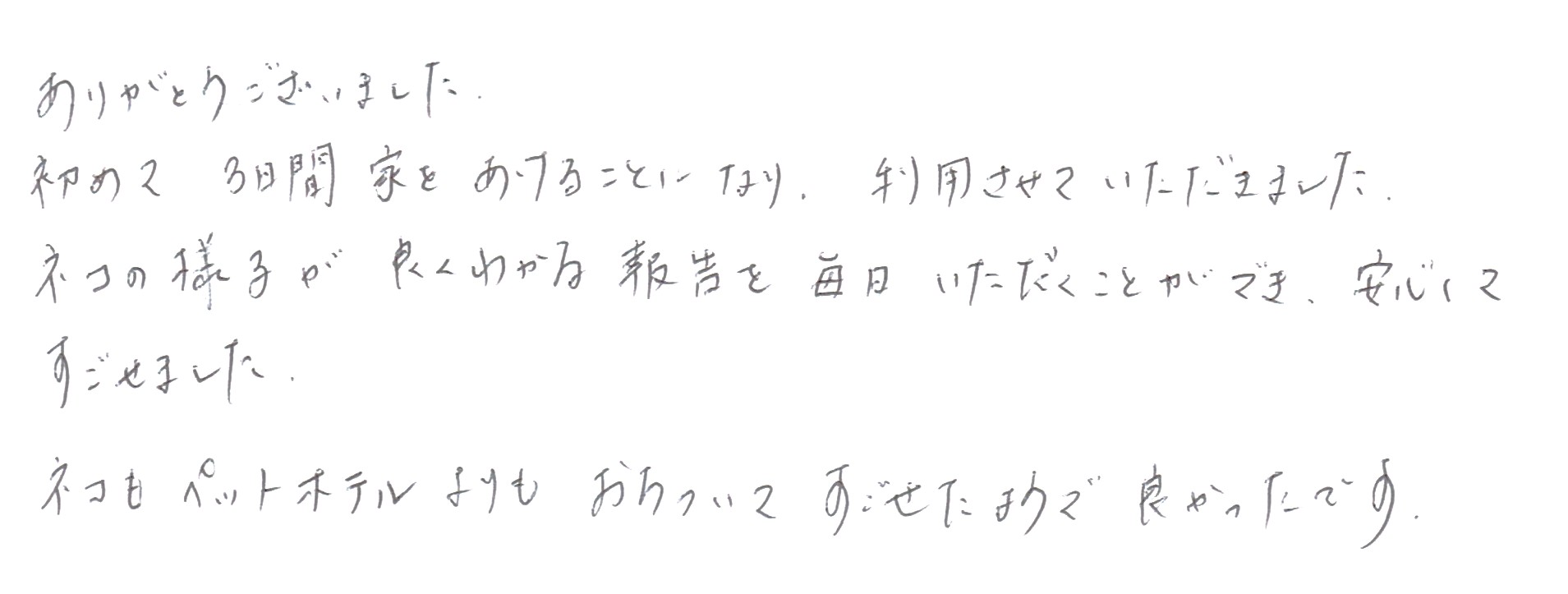 ネコの様子が良くわかる報告を毎日いただくことができ、安心してすごせました。
