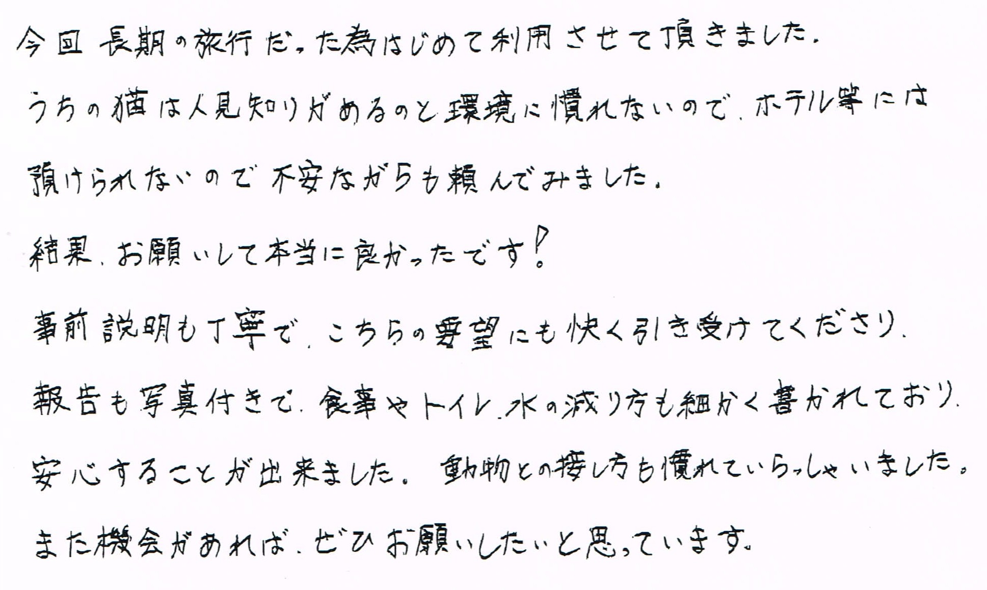 事前説明も丁寧で、こちらの要望にも快く引き受けてくださり、報告も写真付きで、食事やトイレ、水の減り方も細かく書かれており 安心することが出来ました。動物との接し方も慣れていらっしゃいました。