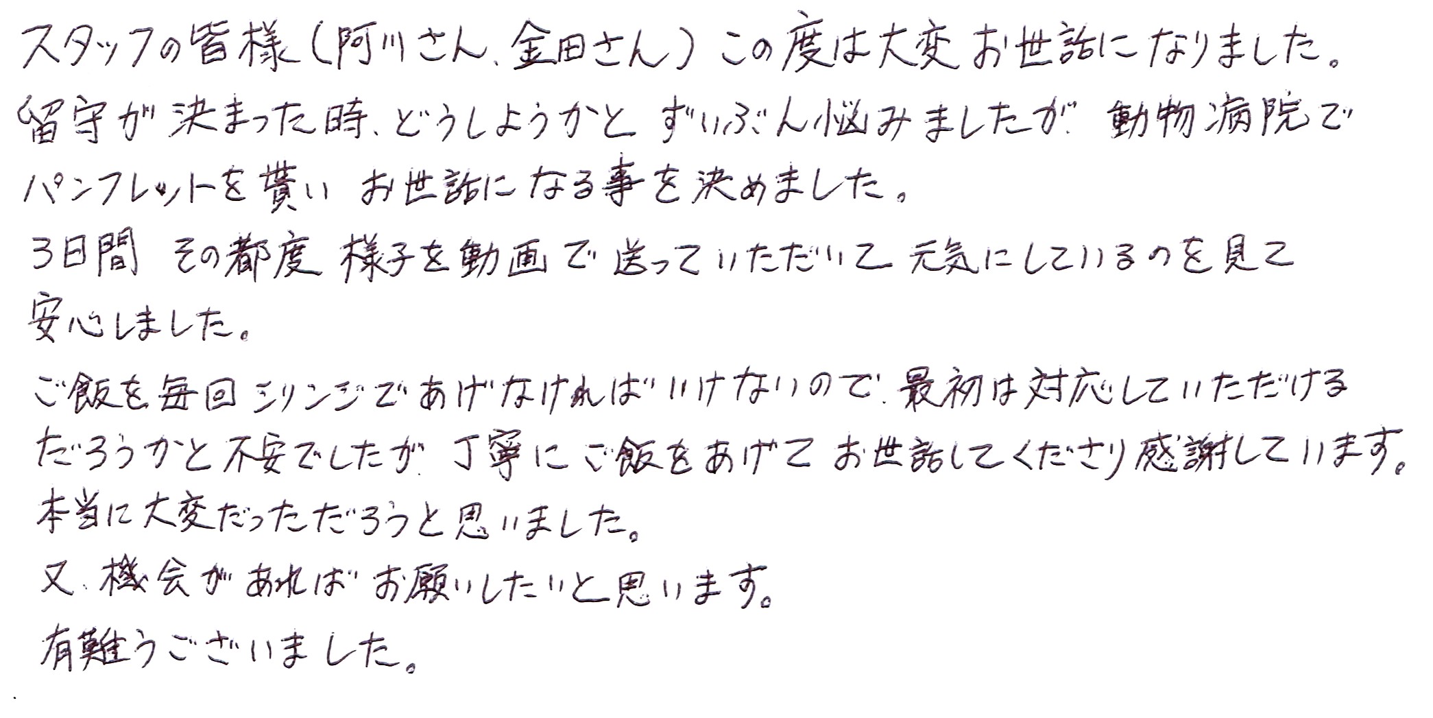 ご飯を毎回シリンジであげなければいけないので、最初は対応していただけるだろうかと不安でしたが、丁寧にご飯をあげてお世話してくださり感謝しています。