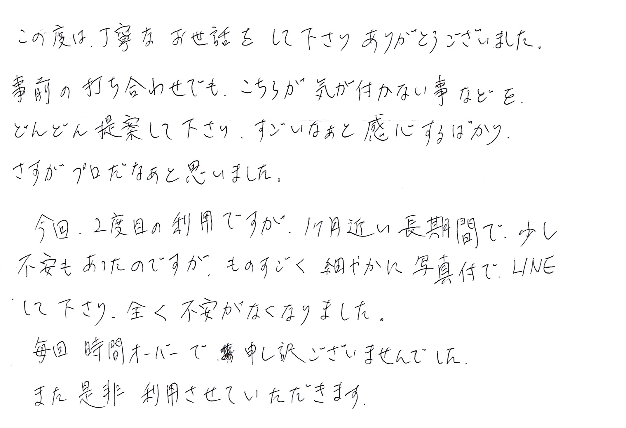 今回、2度目の利用ですが、1ヶ月近い長期間で、少し不安もあったのですが、ものすごく細やかに写真付でLINEして下さり、全く不安がなくなりました。