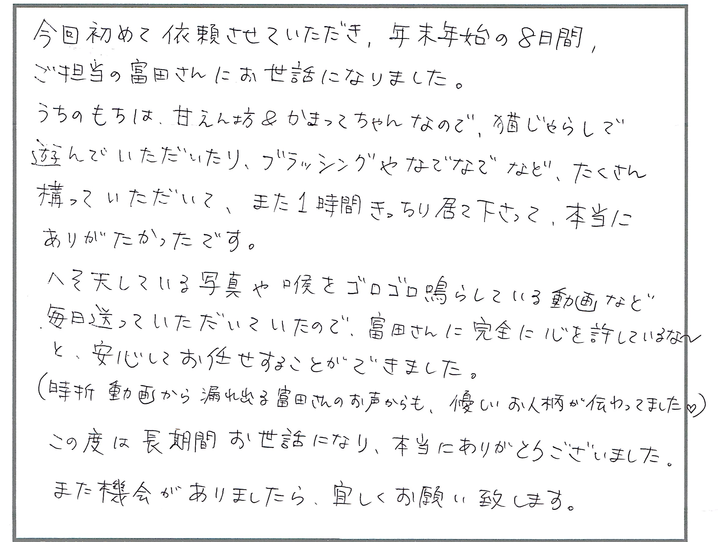 へそ天している写真や、喉をゴロゴロ鳴らしている動画など、毎日送っていただいていたので、富田さんに完全に心を許しているな~と、安心してお任せすることができました。