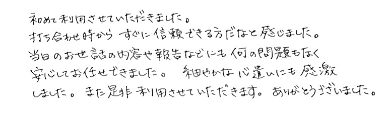 当日のお世話の内容や報告などにも何の問題もなく、安心してお任せできました。