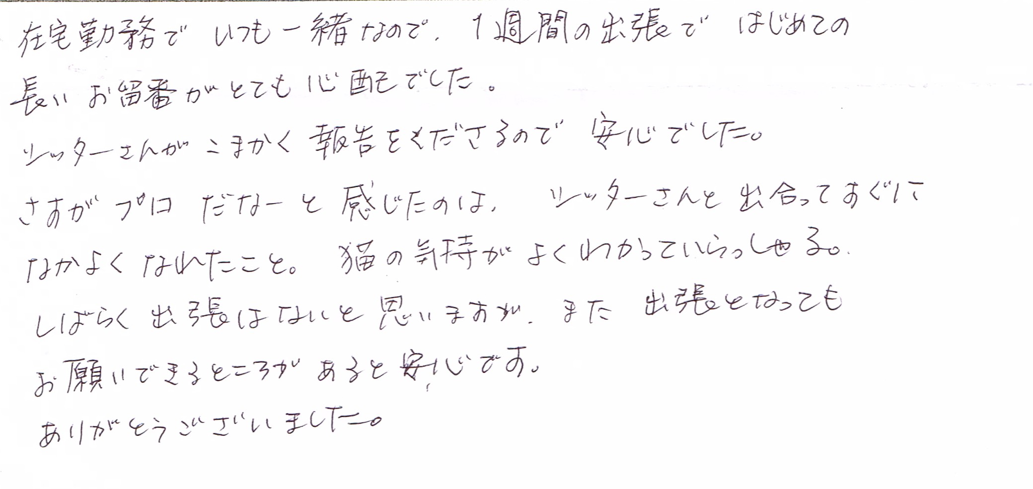 しばらく出張はないと思いますが、また出張となってもお願いできるところがあると安心です。