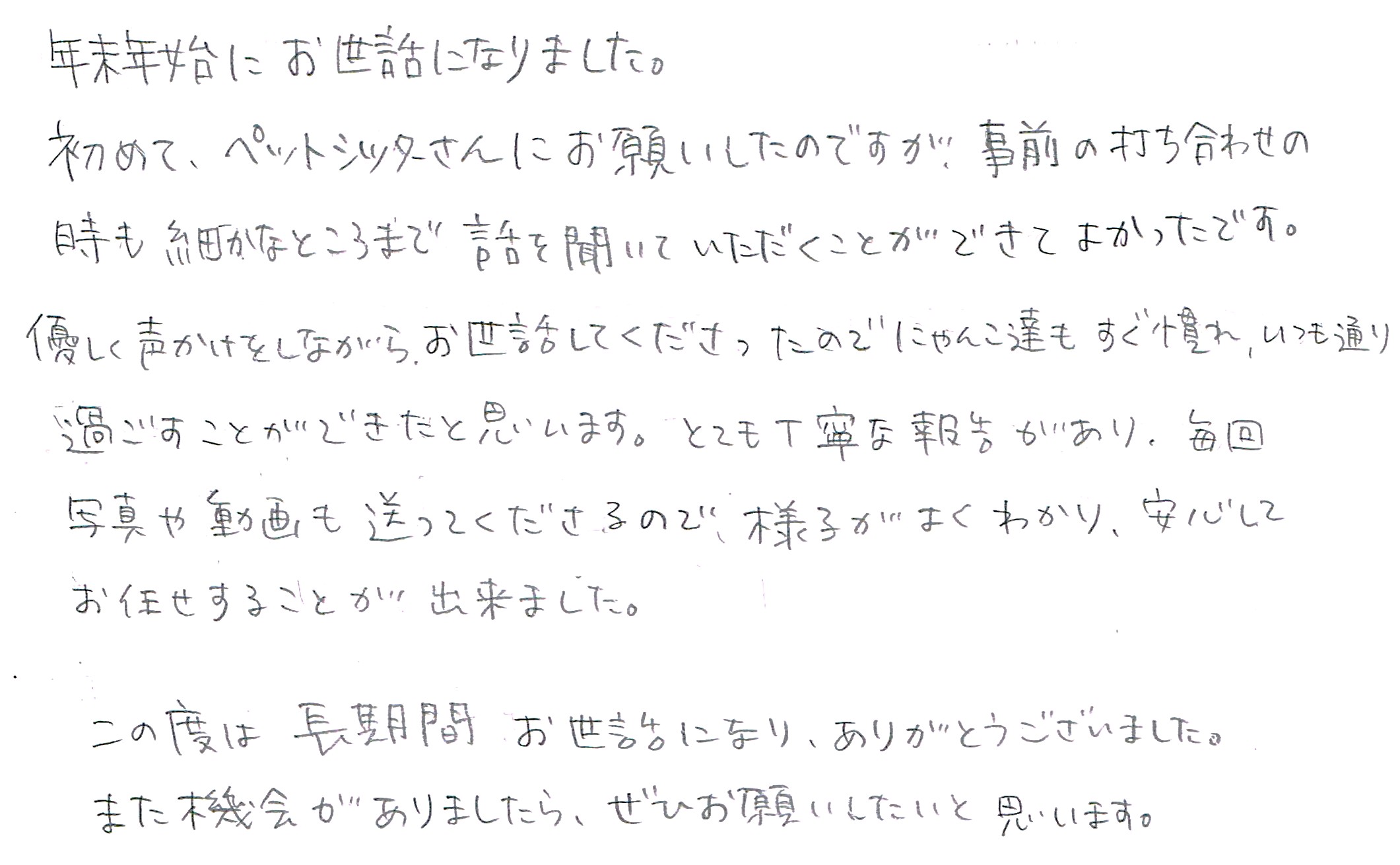 初めて、ペットシッターさんにお願いしたのですが、事前の打ち合わせの時も、細かなところまで話を聞いていただくことができてよかったです。