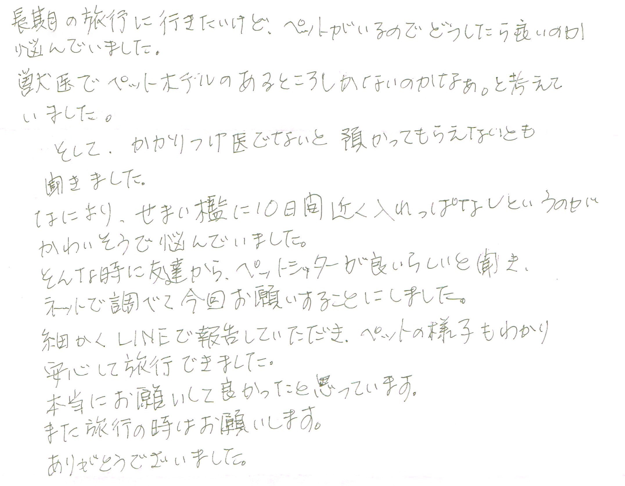 細かくLINEで報告していただき、ペットの様子もわかり安心して旅行できました。