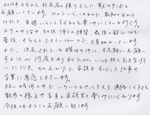 短い時間の中で、いろいろとやって下さり、連絡して下さる散歩の様子や写真を家族ともども楽しみにしております。今後ともよろしくお願い致します。