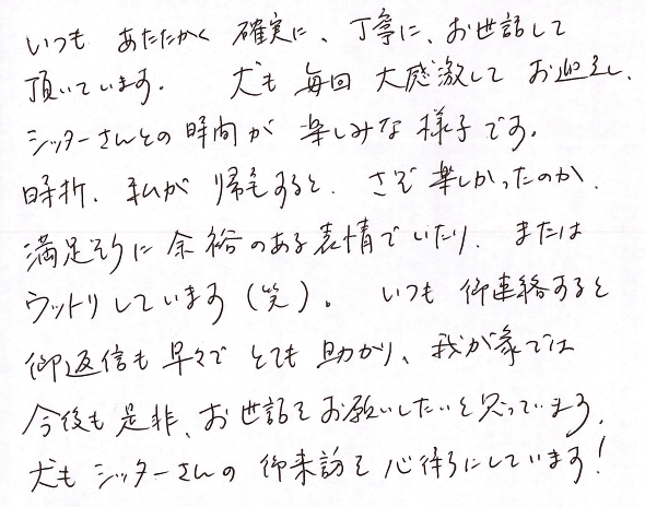 いつも、あたたかく確実に、丁寧にお世話して頂いています。犬も毎回大感激してお出迎えし、シッターさんとの時間が楽しみな様子です。時折、私が帰宅すると、さぞ楽しかったのか、満足そうに余裕のある表情でいたり、またはウットリしています(笑)。いつも御連絡すると、御返信も早々でとても助かり、我が家では今後も是非、お世話をお願いしたいと思っています。犬もシッターさんの御来訪を心待ちにしています!