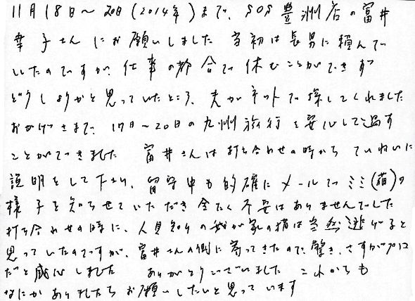 11月18日〜20日(2014年)まで、SOS豊洲店の富井幸子さんにお願いしました。当初は長男に頼んでいたのですが、仕事の都合で休むことができずどうしようかと思っていたところ、夫がネットで探してくれました。おかげさまで、17日〜20日の九州旅行を安心して過すことができました。富井さんは打ち合わせの時からていねいに説明をして下さり、留守中も的確にメールでミミ(猫)の様子を知らせていただき、全く不安はありませんでした。