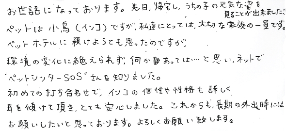 初めての打ち合わせで、インコの個性や性格も詳しく耳を傾けて頂き、とても安心しました。これからも長期の外出時にはお願いしたいと思っております。よろしくお願い致します。