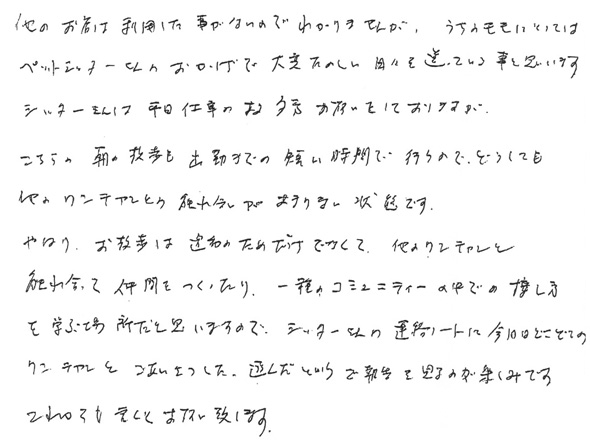 やはり、お散歩は運動のためだけでなくて、他のワンちゃんと触れ合って仲間をつくったり、一種のコミュニティーの中での接し方を学ぶ場所だと思いますので、シッターさんの連絡ノートに今日はどこどこのワンちゃんとごあいさつした、遊んだという報告を見るのが楽しみです。