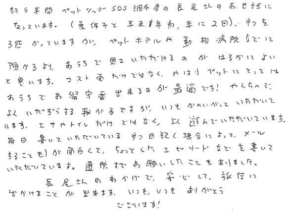 約5年間ペットシッターSOS調布店の長尾さんのお世話になっています。(夏休みと年末年始、年に2回)。