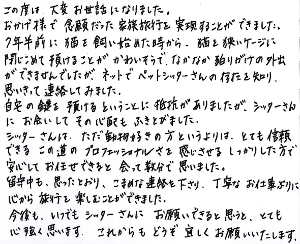 自宅の鍵を預けるということに抵抗がありましたが、シッターさんにお会いしてその心配もふきとびました。