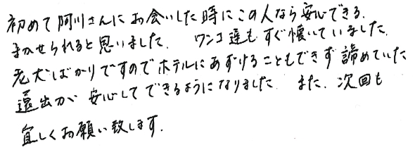 初めて阿川さんにお会いした時に、この人なら安心できる、まかせられると思いました。ワンコ達もすぐ懐いていました。老犬ばかりですのでホテルにあずけることもできず諦めていた遠出が安心してできるようになりました。また、次回も宜しくお願い致します。