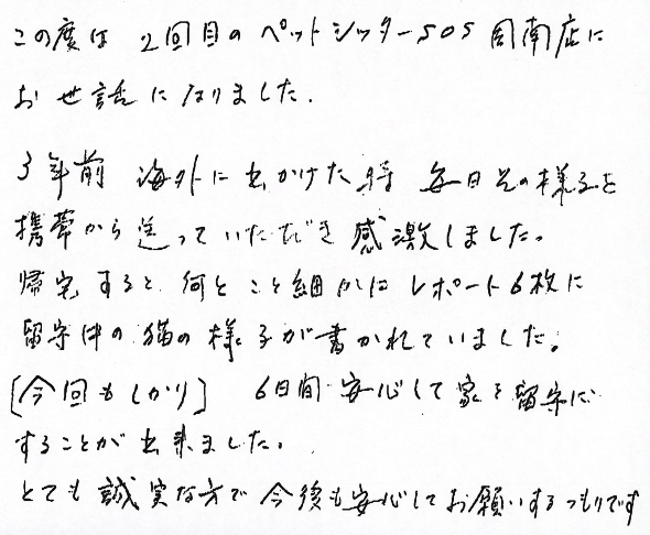 この度は2回目のペットシッターSOS周南店にお世話になりました。3年前、海外に出かけた時、毎日その様子を携帯から送っていただき感激しました。帰宅すると、何とこと細かにレポート6枚に留守中の猫の様子が書かれていました。