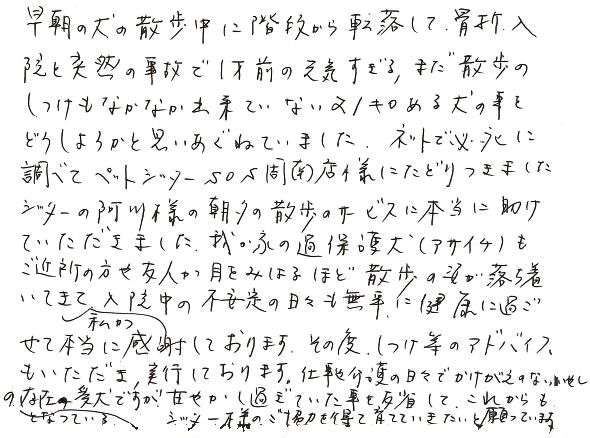 早朝の犬の散歩中に階段から転落して、骨折入院と突然の事故で、1才前の元気すぎる、まだ散歩のしつけもなかなか出来ていない21キロある犬の事をどうしようかと思いあぐねていました。ネットで必死に調べてペットシッターSOS周南店様にたどりつきました。