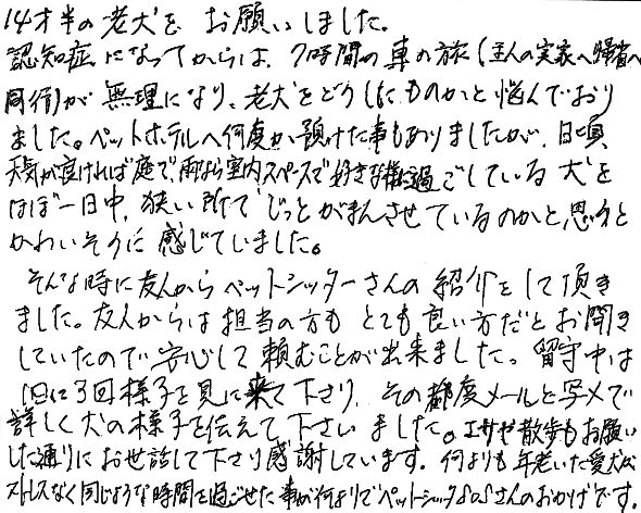 何よりも年老いた愛犬がストレスなく同じような時間を過ごせた事が何よりで、ペットシッターSOSさんのおかげです。