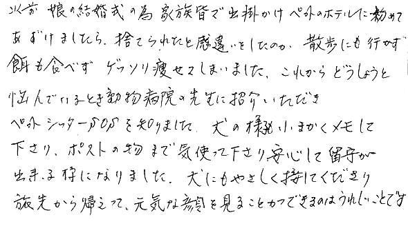 これからどうしようと悩んでいるとき動物病院の先生に紹介いただき、ペットシッターSOSを知りました。犬の様子も細かくメモして下さり、ポストの物まで気遣って下さり安心して留守が出来る様になりました。