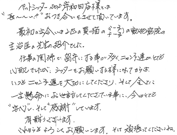 最初の出会いは2匹の飼い猫ミー子、チー子の動物病院の主治医の先生の紹介でした。仕事の関係で留守にする事が多く、ニャン子達がとても心配でしたが、シッターをお願いする様になってからは、いつもニャン子達を大切にしてくださり、そして全てに一生懸命にお世話してくださっている事に、今はとても"安心"し、そして"感謝"しています。有難うございます。