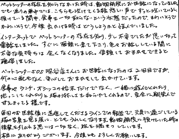 ペットシッターSOS深谷店さんにお世話になったのは2回目ですが、何の心配もなく安心してお任せして出かけています。