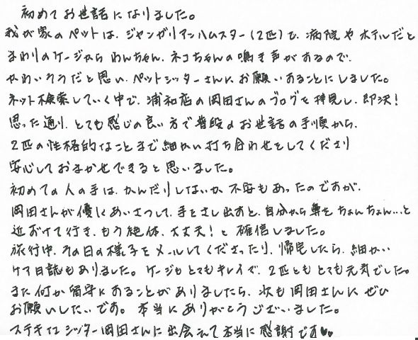 初めてお世話になりました。我が家のペットはジャンガリアンハムスター(2匹)で、病院やホテルだとまわりのケージからわんちゃん・ネコちゃんの鳴き声がするので、かわいそうだと思い、ペットシッターさんにお願いすることにしました。ネット検索していく中で、さいたま浦和店の岡田さんのブログを拝見し、即決!思った通り、とても感じの良い方で普段のお世話の手順から、2匹の性格的なことまで細かい打ち合わせをしてくださり、安心しておまかせできると思いました。