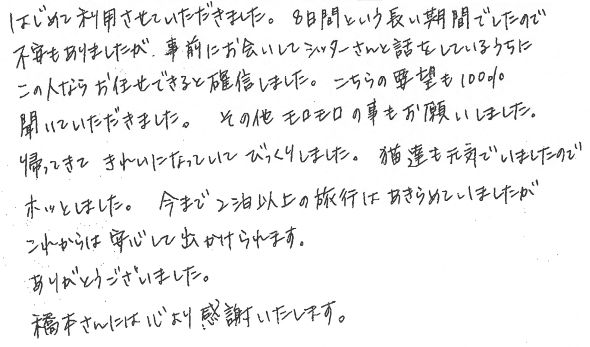 こちらの要望も100%聞いていただきました。その他モロモロの事もお願いしました。帰ってきてきれいになっていてびっくりしました。猫達も元気でいましたのでホッとしました。今まで2泊以上の旅行はあきらめていましたが、これからは安心して出かけられます。