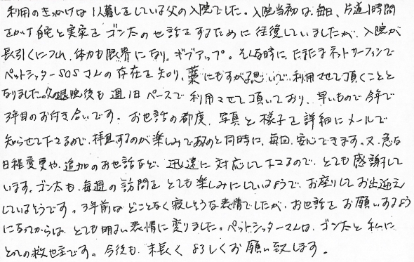 入院当初は毎日片道1時間をかけ自宅と実家をゴン太の世話をするために往復していましたが、入院が長引くにつれ、体力も限界になりギブアップ。そんな時に、たまたまネットサーフィンでペットシッターSOSさんの存在を知り、藁にもすがる思いで利用させて頂くこととなりました。