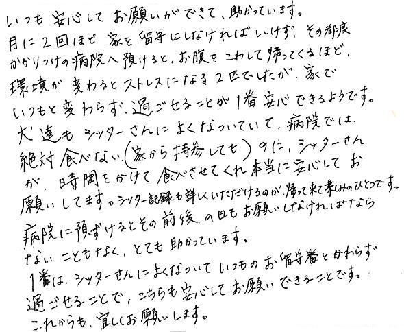 犬達もシッターさんによくなついていて、病院では絶対食べない(家から持参しても)のに、シッターさんが時間をかけて食べさせてくれ本当に安心してお願いしてます。シッター記録も詳しくいただけるのが、帰って来て楽しみのひとつです。
