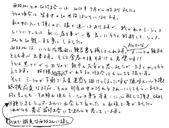 うちは黒ラブが二匹なので、散歩も大変かと思いましたが、上手くやってもらえてます。粘り強くなるべくウンチが出るまで付き合ってもらってる様です。そして、ミーシャが下痢で大変迷惑を掛けてしまった時も随時メールを頂き、臨機応変な対応、その上部屋の中の汚れをきれいにしてもらいました。何と言っても、その時も後も、ミーシャの事を本当に心配して頂き、改めてまじめで誠実な西村さんに接し、信頼出来るシッターさんに出会えて良かったと家族で喜びました。これからも長くお付き合いできたらと思っています。