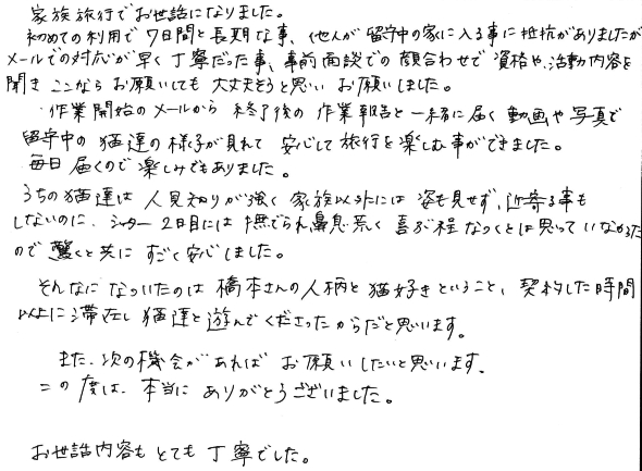 うちの猫達は人見知りが強く、家族以外には姿も見せず、近寄る事もしないのに、シッター2日目には撫でられ鼻息荒く喜ぶ程なつくとは思っていなかったので、驚くと共にすごく安心しました。