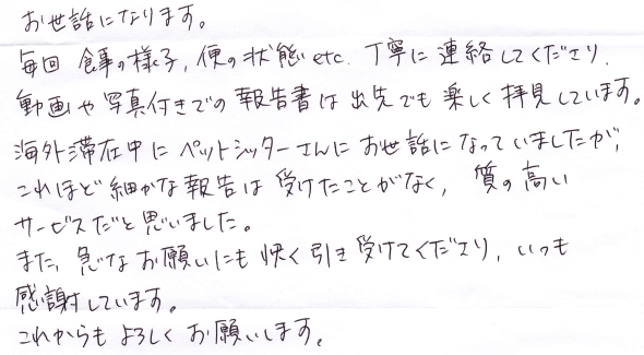 お世話になります。毎回食事の様子、便の状態etc..丁寧に連絡してくださり、動画や写真付きでの報告書は出先でも楽しく拝見しています。海外滞在中にペットシッターさんにお世話になっていましたが、これほど細かな報告は受けたことがなく、質の高いサービスだと思いました。