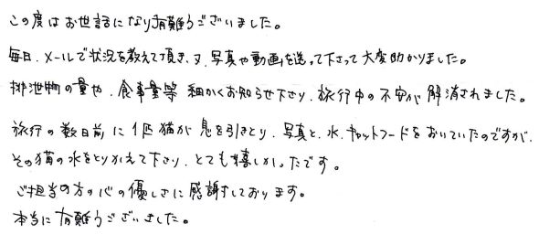 この度はお世話になり有難うございました。毎日メールで状況を教えて頂き、又、写真や動画を送って下さって大変助かりました。排泄物の量や、食事量等細かくお知らせ下さり、旅行中の不安が解消されました。