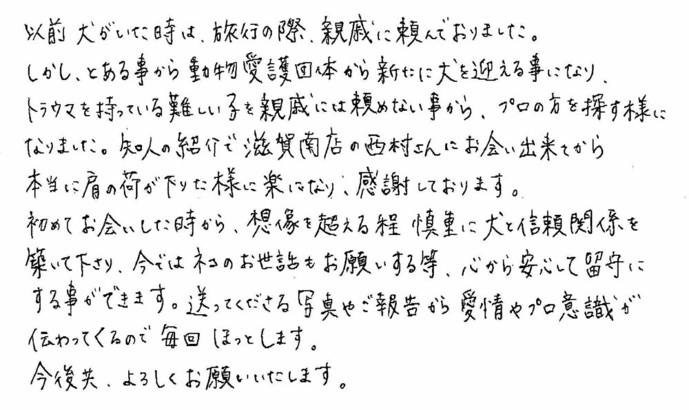 初めてお会いした時から、想像を超える程慎重に犬と信頼関係を築いて下さり、今ではネコのお世話もお願いする等、心から安心して留守にする事ができます。