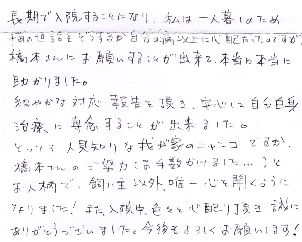 長期で入院することになり、私は一人暮らしのため猫の世話をどうするか自分の病以上に心配だったのですが、橋本さんにお願いすることが出来て、本当に本当に助かりました。