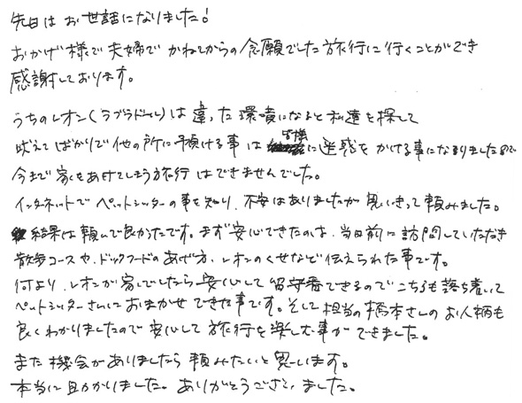 何より、レオンが家でしたら安心して留守番できるので、こちらも落ち着いてペットシッターさんにおまかせできた事です。そして担当の橋本さんのお人柄も良くわかりましたので安心して旅行を楽しむ事ができました。