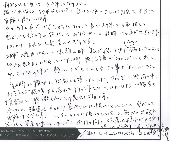 猫との生活は20年以上です。よいシッターさんに出会えて、本当に有難く思っています。