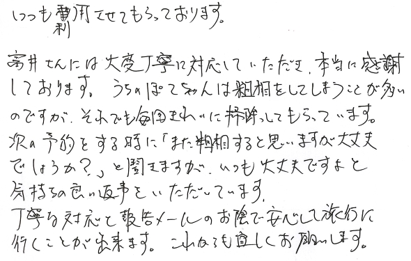 丁寧な対応と報告メールのお陰で安心して旅行に行くことが出来ます。これからも宜しくお願いします。