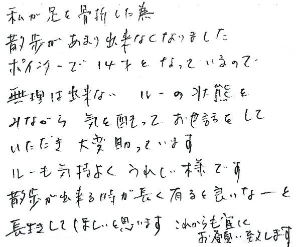 ポインターで14才となっているので無理は出来ないルーの状態をみながら、気を配ってお世話をしていただき大変助かっています。