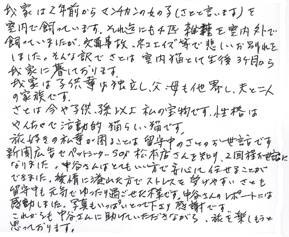 旅好きの私達が困ることは留守中のさとのお世話です。新聞広告でペットシッターSOS松本店さんを知り、2回程お世話になりました。中谷さんはとてもいい方で安心して任せることができました。愛情に溢れた方でストレスを受けやすいさとも留守中も元気でゆったり過ごせた様です。中谷さんのレポートには感動しました。写真もいっぱいとって下さり感謝です。
