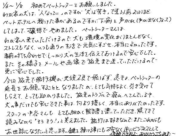 今回、旅先で飛行機が天候不良で飛ばず、急きょペットシッターの延長をお願いすることとなりましたが、とても気持ちよく引き受けてもらえて、とっても助かりました。旅先のトラブルで疲れ、へんこんでいる中、犬の事だけでも安心できた事は、何より嬉しく、本当にありがたかったです。