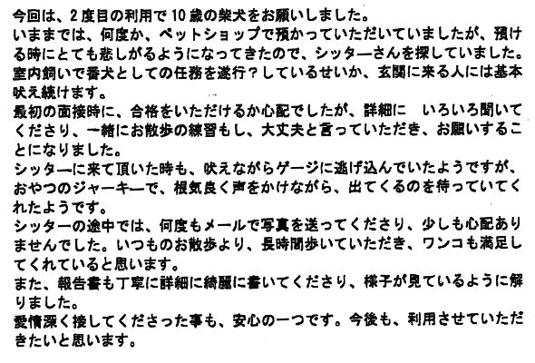 今回は、2度目の利用で10歳の柴犬をお願いしました。いままでは、何度か、ペットショップで預かっていただいていましたが、預ける時にとても悲しがるようになってきたので、シッターさんを捜していました。室内飼いで番犬としての任務を遂行?しているせいか、玄関に来る人には基本吠え続けます。最初の面接時に、合格をいただけるか心配でしたが、詳細にいろいろ聞いてくださり、一緒にお散歩の練習もし、大丈夫と言っていただき、お願いすることになりました。