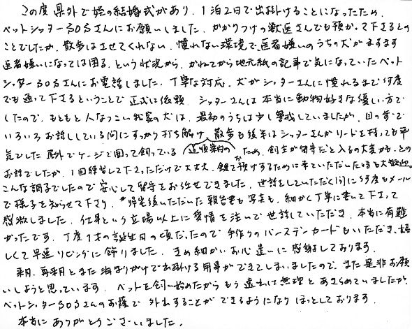 ペットを飼い始めた頃から、もう遠出は無理とあきらめていましたが、ペットシッターSOSさんのお陰で外出することができるようになり、ほっとしております。本当にありがとうございました。