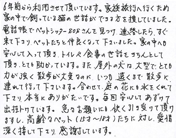 家族旅行へ行くため、家の中で飼っている猫の世話ができる方を捜していました。電話帳でペットシッターSOSさんを見つけ連絡したらすぐ来て下さり、ペットたちと仲良くなって下さいました。