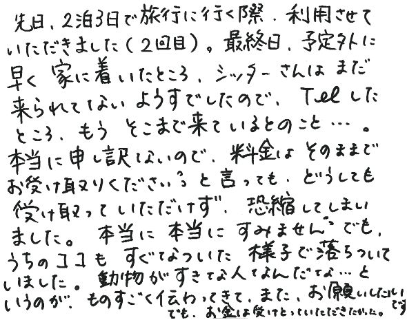 最終日、予定外に早く家に着いたところ、シッターさんはまだ来られてないようすでしたので、Telしたところ、もうそこまで来ているとのこと…。本当に申し訳ないので、料金はそのままでお受け取りください、と言っても、どうしても受け取っていただけず、恐縮してしまいました。本当に本当にすみません。