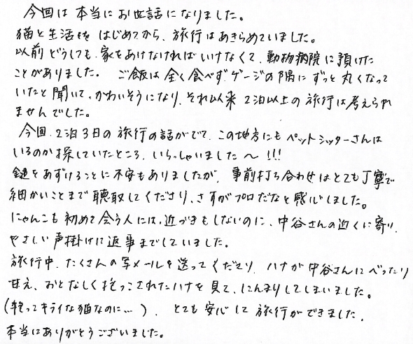 鍵をあずけることに不安もありましたが、事前打ち合わせはとても丁寧で細かいことまで聴取してくださり、さすがプロだなと感心しました。にゃんこも初めて会う人には近づきもしないのに、中谷さんの近くに寄り、やさしい声掛けに返事までしていました。旅行中、たくさんの写メールを送ってくださり、ハナが中谷さんにべったり甘え、おとなしく抱っこされた花を見て、にんまりしてしまいました。(抱っこキライな猫なのに…) とても安心して旅行ができました。本当にありがとうございました。