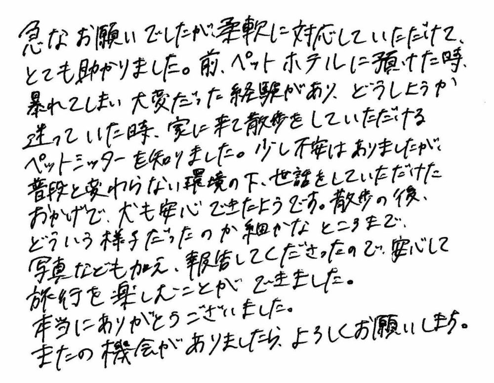 前、ペットホテルに預けた時、暴れてしまい大変だった経験があり、どうしようか迷っていた時、家に来て散歩をしていただけるペットシッターを知りました。